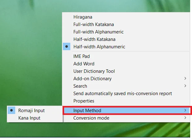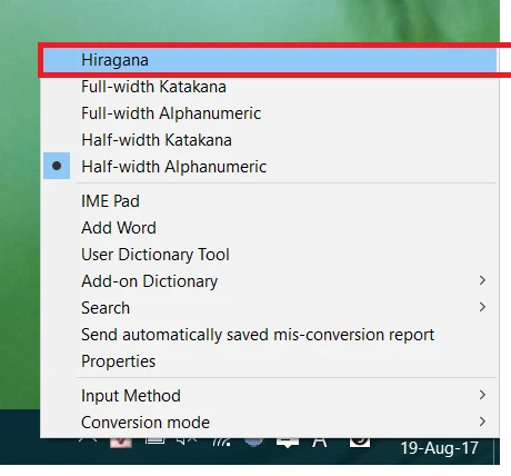 Mặc định chọn chế độ Half-width Alphanumeric ( chế độ gõ chữ Latin ) cách gõ tiếng Nhật trên Win 10 là chuyển sang chế độ Hiragana.